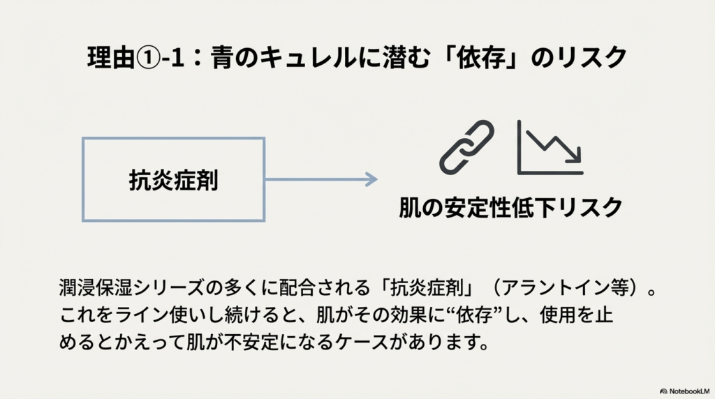 有効成分のアラントインやグリチルリチン酸ジカリウムは、肌荒れを防ぐ優れた成分です。しかし、私の経験上、これをライン使いし続けると、肌がその「炎症を抑える効果」に依存してしまうという懸念があります。その結果、抗炎症剤の入っていない化粧品に切り替えた途端、これまで抑えられていた潜在的な炎症が表面化し、かえって肌が不安定になるケースを見てきました。