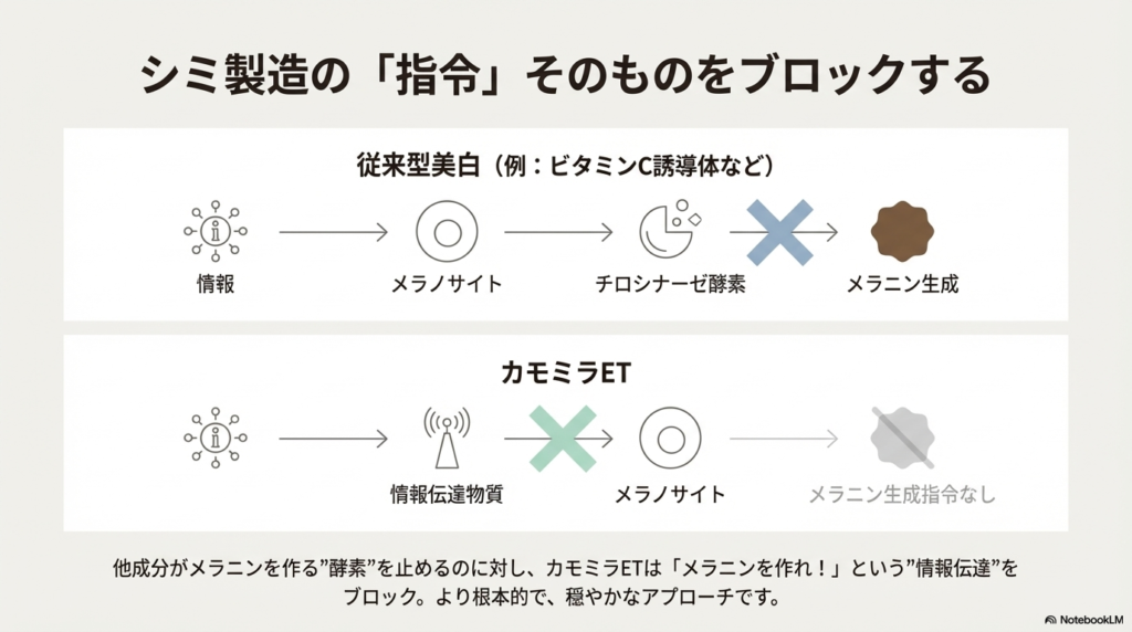 カモミラETの最大の特徴は、そのユニークな作用機序にあります。多くの美白有効成分(ビタミンC誘導体やコウジ酸など)が、メラニンを生成する酵素「チロシナーゼ」の活性を直接阻害するのに対し、カモミラETはシミ製造の「指令」そのものを止める、より根本的で穏やかなアプローチを採っています。具体的には、「メラニンを作れ!」という細胞への情報伝達物質(エンドセリン)をブロックすることで、シミ・そばかすの発生を未然に防ぐのです。