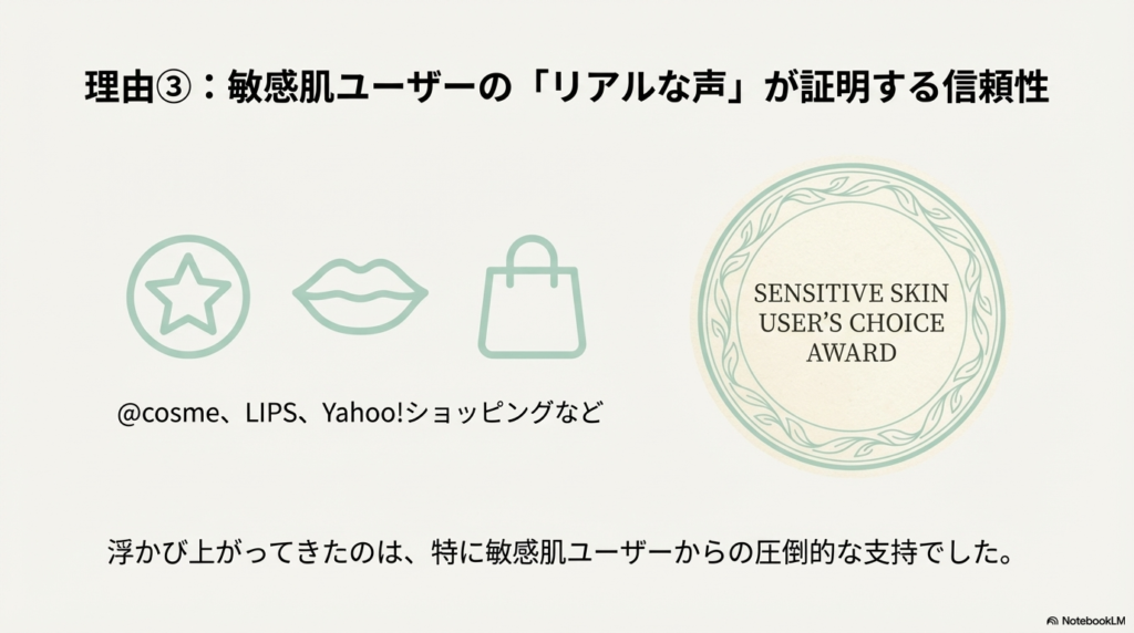 @cosme、LIPS、Yahoo!ショッピングなどの大手口コミサイトを分析すると、特に敏感肌ユーザーからの圧倒的な支持が見られます。その評価をまとめると、主に3つのポイントに集約されます。