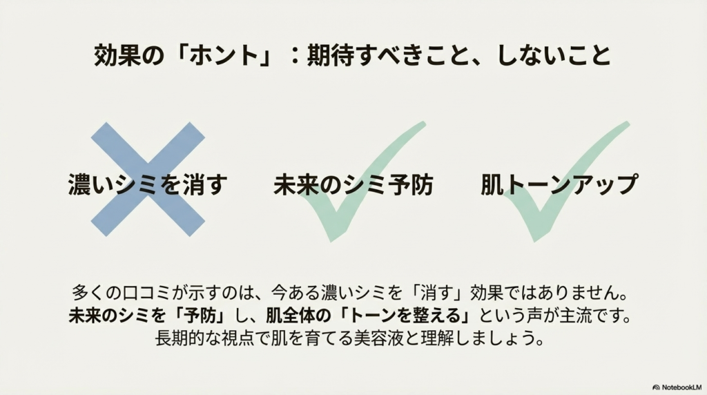 一方で、多くの口コミに共通するのは、今ある濃いシミを劇的に消すというよりは、「これからのシミ・そばかすを予防する」「肌全体のトーンを整える」という効果を実感している方が多い点です。即効性を求めるのではなく、肌を育てながら未来のシミを防ぐ、という視点で使うのが良いでしょう。