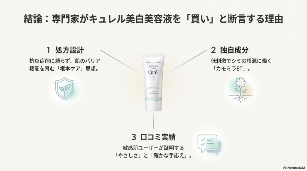 キュレルの美白美容液が専門家の視点から「買い」である理由は、単なる美白効果に留まりません。それは、抗炎症剤という対症療法に頼らず、擬似セラミドによって肌本来のバリア機能を根本から育むという、より本質的な処方設計にあります。さらに、花王独自の低刺激な有効成分「カモミラET」が、シミの根本原因に穏やかにアプローチするため、敏感肌でも安心して未来の肌への投資ができるのです。口コミでの圧倒的な支持は、この「やさしさ」と「確かな手応え」の証明に他なりません。