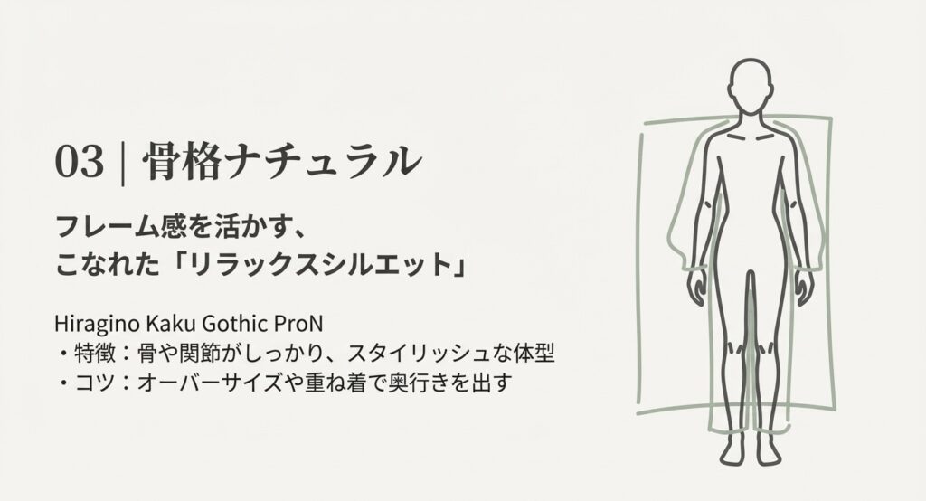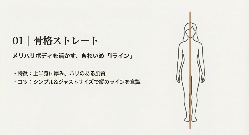骨格ストレートタイプは、体にメリハリがあり、上半身に厚みが出やすい「上重心」の体型です。肌にはハリ感のある肌質なのが特徴。スタイリングのコツは、シンプルでベーシックなジャストサイズのアイテムを選び、縦の「Iライン」を意識することです。縦の「Iライン」を意識することで、上半身の厚みを自然にカバーし、全身をすっきりと見せる効果があります。