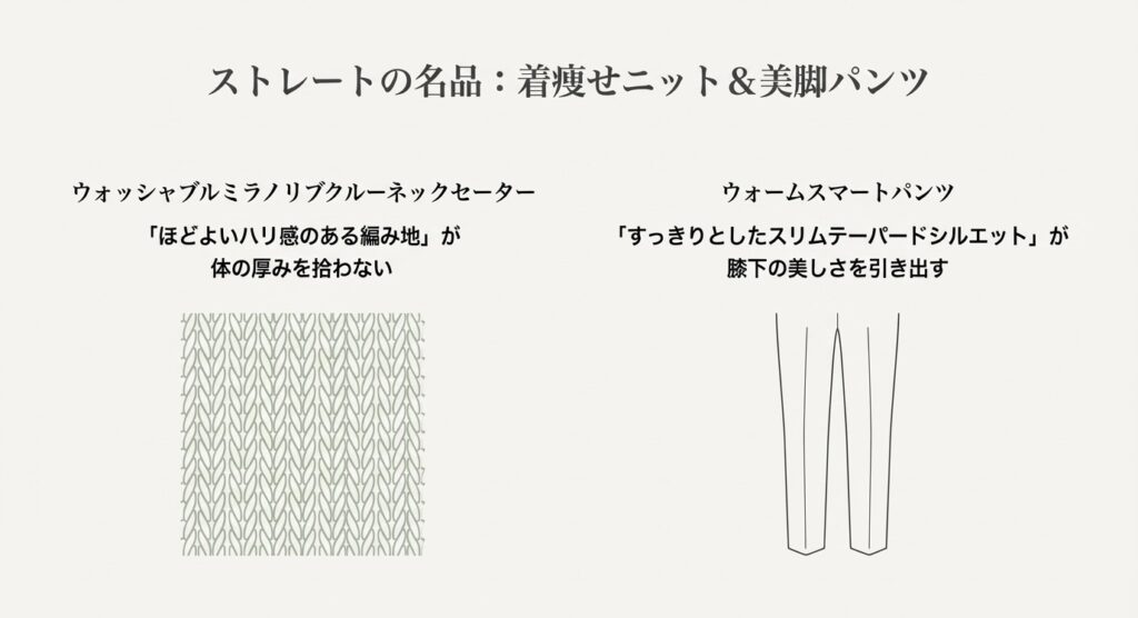 骨格ストレートタイプの持つハリのある肌質と、このセーターの「ほどよいハリ感のある編み地」が響き合い、安っぽく見えがちな薄手のニットと違って、高級感のある着こなしを可能にします。「クリーンな編み地とシルエット」が体の厚みを拾いすぎず、すっきりとした上品な印象に見せてくれるのもプロの視点から見ても最適です。きれいめな「ウォームスマートパンツ」と合わせれば、オフィスにも対応できる上品なIラインコーデが簡単に完成します。