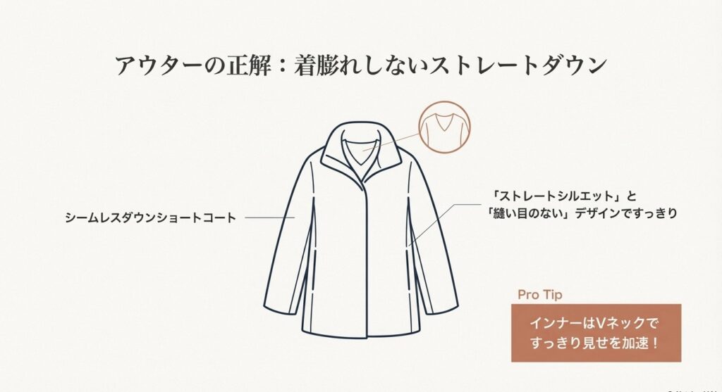 骨格ストレートさんが陥りがちなのが、ダウンによる着膨れです。しかし、このコートは「ストレートシルエット」なので、すっきりと着こなせます。縫い目のないシームレスデザインがボリュームを抑えつつ、暖かさをキープ。Vネックのニットをインナーに合わせると、首元がすっきりして着膨れをさらに防げます。