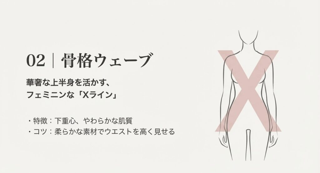 骨格ウェーブタイプは、上半身が華奢で、重心が下半身に寄っているのが特徴。肌の質感はやわらかくソフトです。スタイリングのコツは、柔らかな素材や体にフィットするアイテムを選び、ウエスト位置を高く見せる「Xライン」を意識することです。ウエストをマークして「Xライン」を作ることで、下がり気味の重心をぐっと引き上げ、スタイルアップと同時に女性らしい曲線美を際立たせることができます。