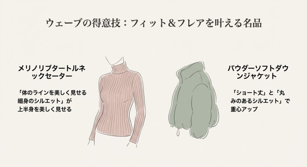 おすすめアイテム①:【メリノリブタートルネックセーター】華奢な上半身を美しく見せるフィット感