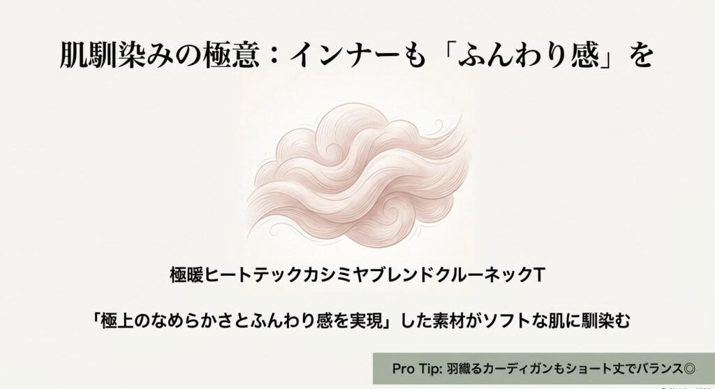 「極上のなめらかさとふんわり感を実現」したカシミヤブレンドの素材は、ウェーブタイプのソフトな肌質によく馴染みます。また、「体の動きに合わせてフィットする」ストレッチ性も、フィット感のある服が得意なウェーブタイプにとって嬉しい特徴です。一枚でもインナーとしても活躍し、カーディガンを羽織る際は、ショート丈を選ぶとバランスが取りやすくなります。