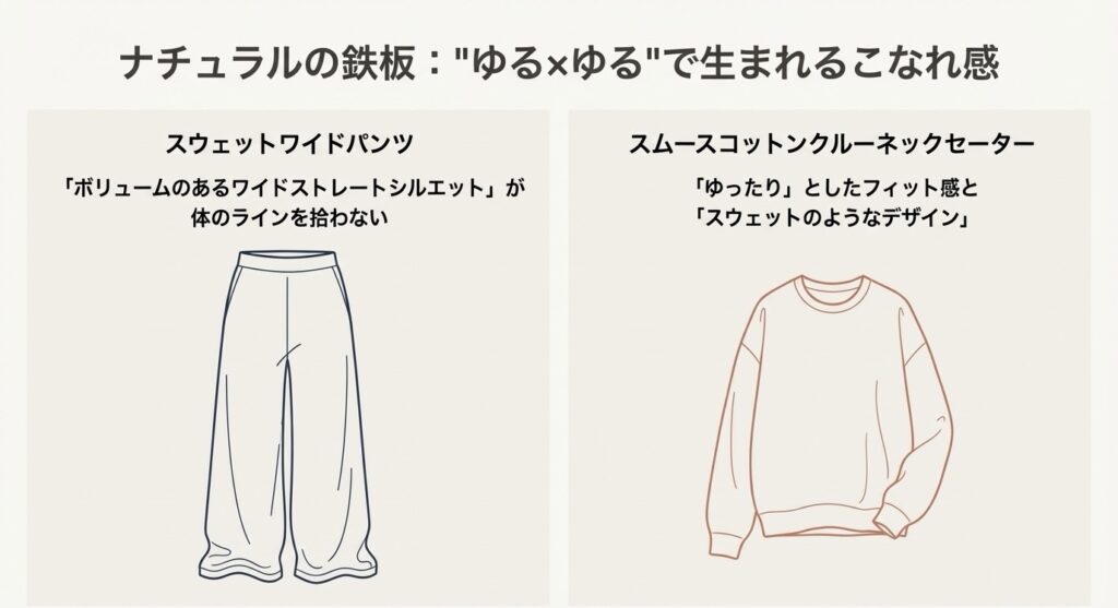 「ボリュームのあるワイドストレートシルエット」は、骨格ナチュラルタイプのための王道シルエット。体のラインを拾わず、こなれた印象に見せてくれます。リラックス感のあるスウェット素材も、カジュアルな雰囲気が得意なナチュラルタイプにぴったり。トップスも少しゆったりめのニットやTシャツを合わせ、”ゆる×ゆる”のこなれたシルエットを楽しみましょう。