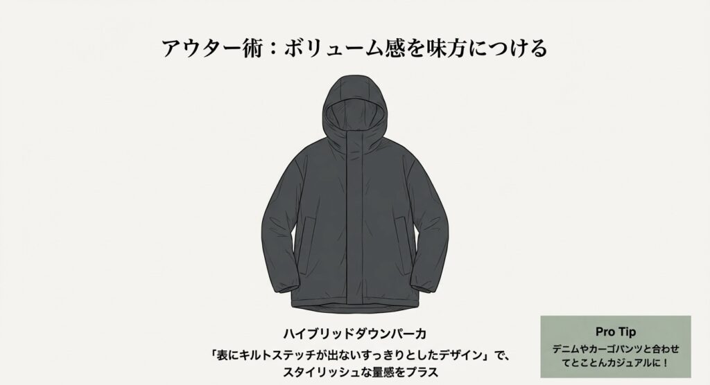 おすすめアイテム③:【ハイブリッドダウンパーカ】ボリューム感を味方につける高機能アウター