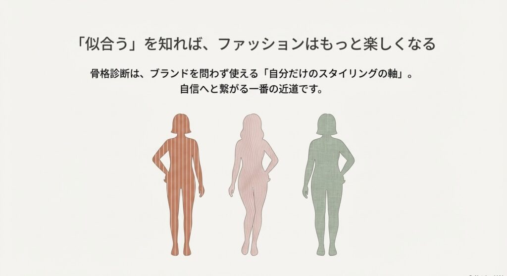 自分の骨格タイプを理解することは、単にユニクロでの服選びが上手になる以上の価値があります。それは、自分の身体を客観的に理解し、どんなブランドの服を選ぶ際にも応用できる「自分だけのスタイリングの軸」を手に入れることです。「自分に似合うもの」を知ることが、30代のファッションをより洗練させ、自信へと繋げる一番の近道です。